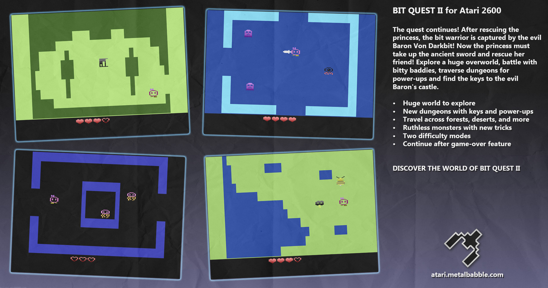 The quest continues! After rescuing the princess, the bit warrior is captured by the evil Baron Von Darkbit! Now the princess must take up the ancient sword and rescue her friend! Explore a huge overworld, battle with bitty baddies, traverse dungeons for power-ups and find the keys to the evil Baron's castle.